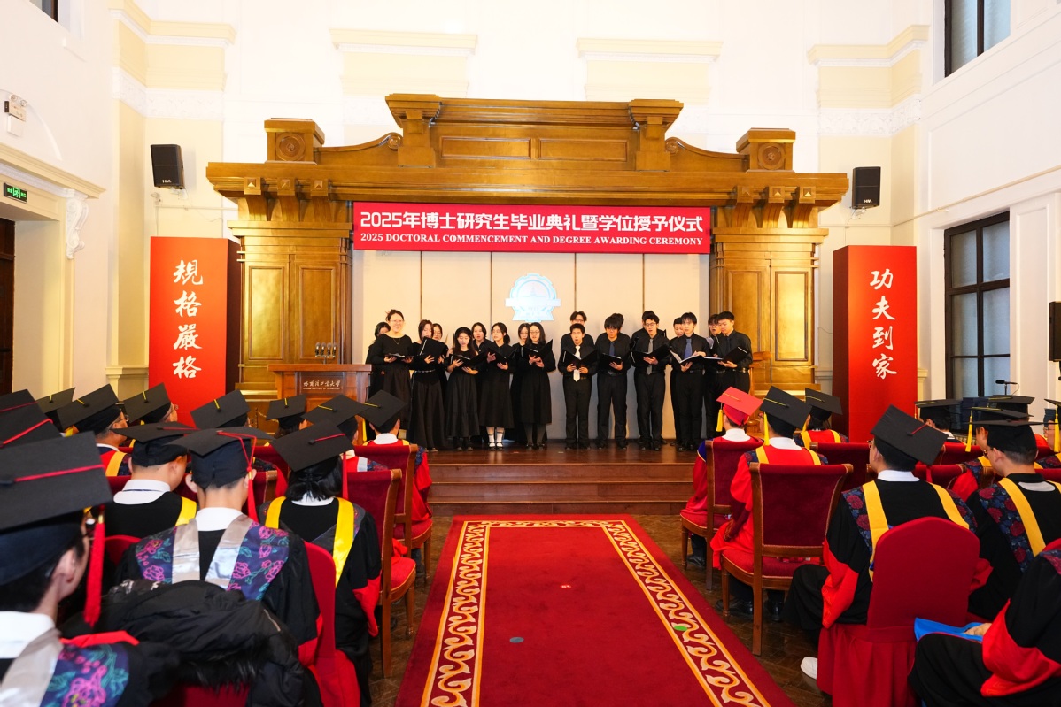 典礼开始前,“国际A级合唱团” MUSICA室内合唱团以《凤凰花开的路口》为博士毕业生送上祝福。伴随着悠扬的乐声,4名博士毕业生献上诗朗诵《光荣的追寻》,致敬一代又一代哈工大“八百壮士”。