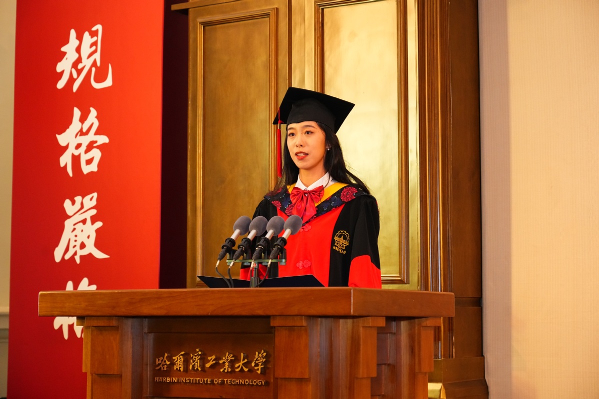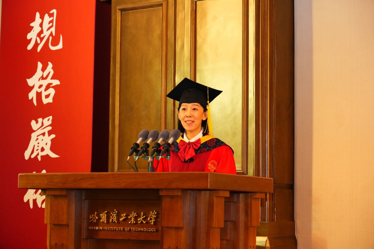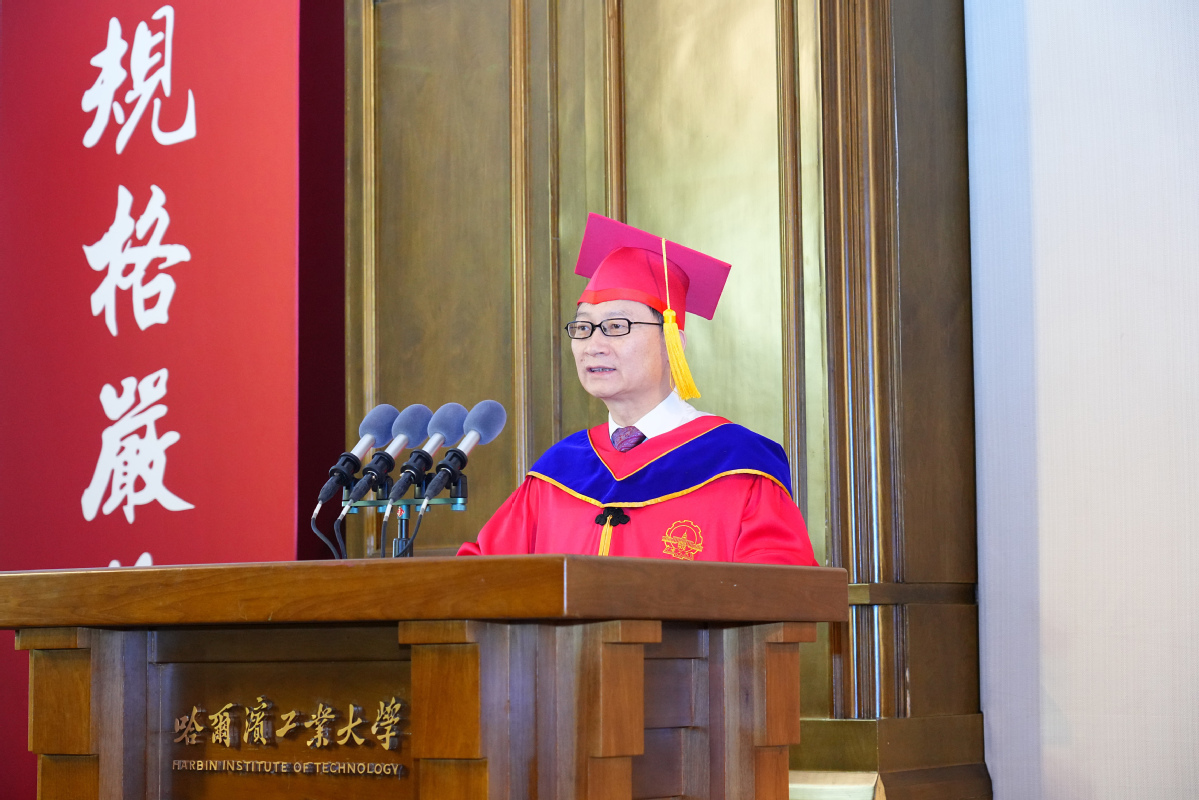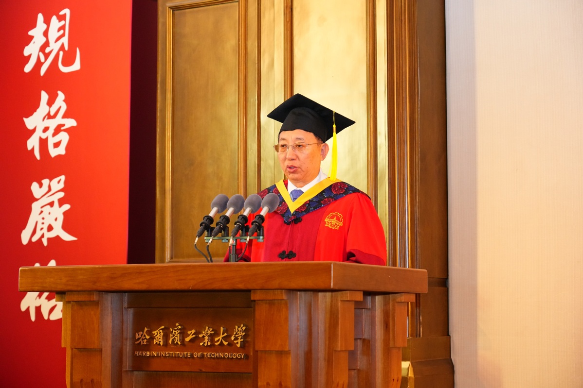 韩杰才代表校党委书记陈杰、代表学校向356名顺利完成学业的博士研究生表示祝贺。他表示,今年是学校收到习近平总书记致哈工大建校100周年贺信5周年和建校105周年。从一所培养铁路工程师的学校,到成长为习近平总书记贺信中“为党和人民作出了重要贡献”的百年名校,哈工大发展壮大的点点滴滴,都凝聚着一代代哈工大人的汗水。同学们既是母校打造顶尖人才培养范式的亲历者,更是学校在新的起点上以顶尖人才服务国之所需的实践者。希望同学们传承许党报国、与国同行的红色基因,牢记嘱托、接续奋斗,怀揣“尖兵”之志、勇担“尖兵”使命、续写“尖兵”传奇。