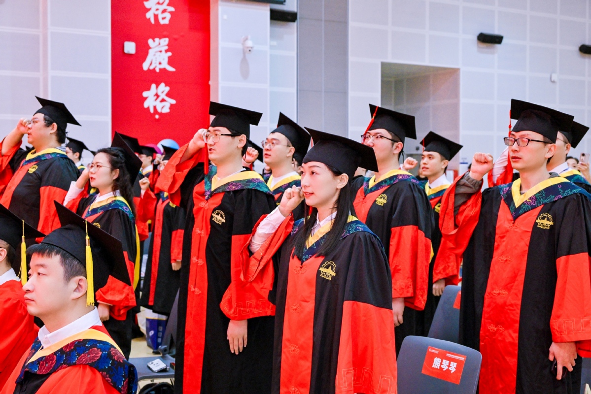 “不负时代! 不负韶华! 不负母校!奋力书写为中国式现代化挺膺担当的青春篇章!”在毕业生代表的领誓下,全体毕业生进行青春宣誓。